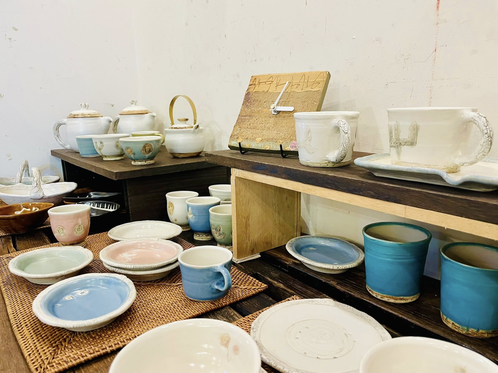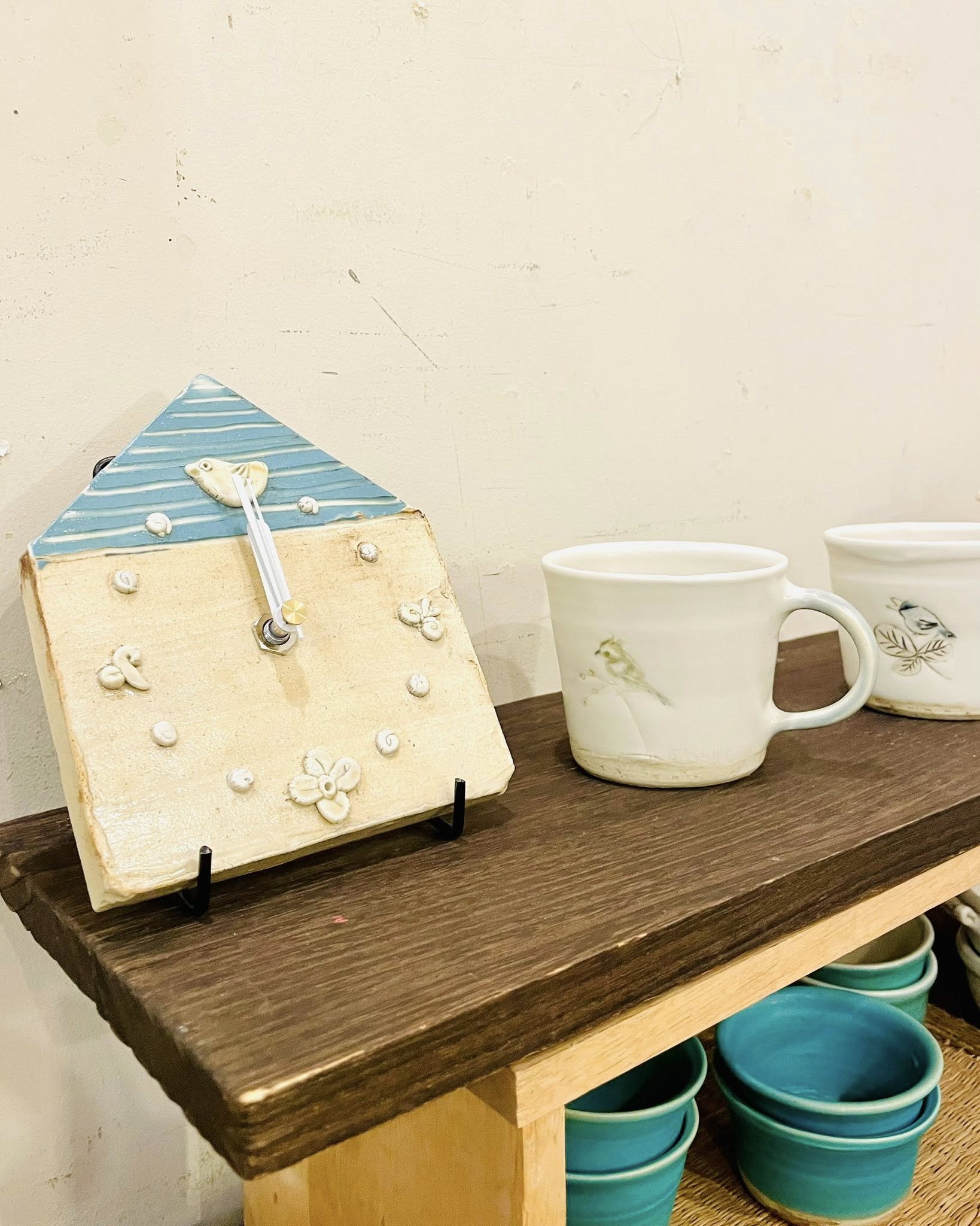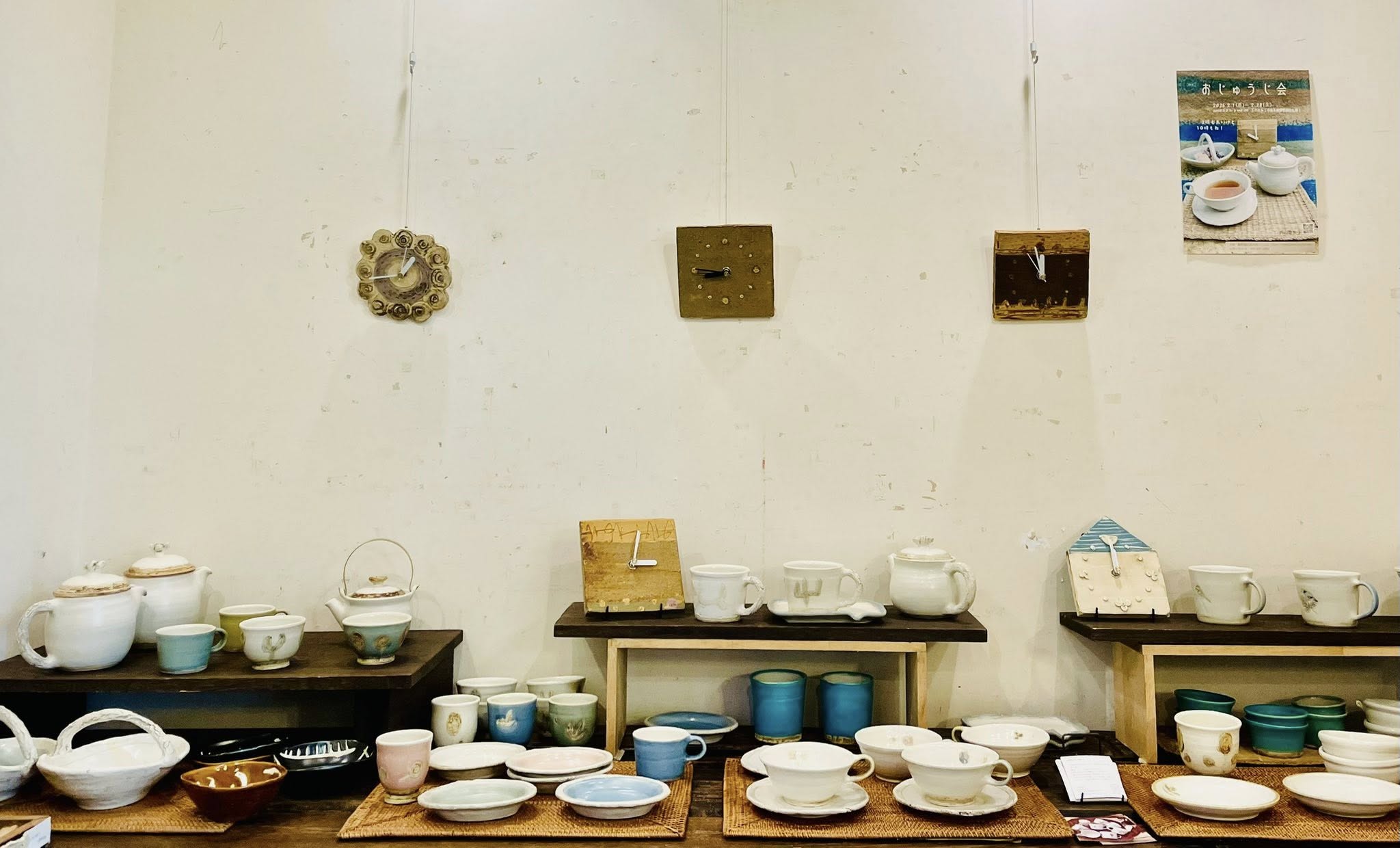 半磁器のカップやお皿などが人気の内山さん。3時のおやつだけではなく10時のおやつも良いもの…ということで、ティータイムに活躍してくれるティーポットや急須、カップにソーサー、おやつを盛るお皿などが、大きさもモチーフもさまざまに揃っています。焼き物の時計というのも魅力的。ぜひご覧ください。